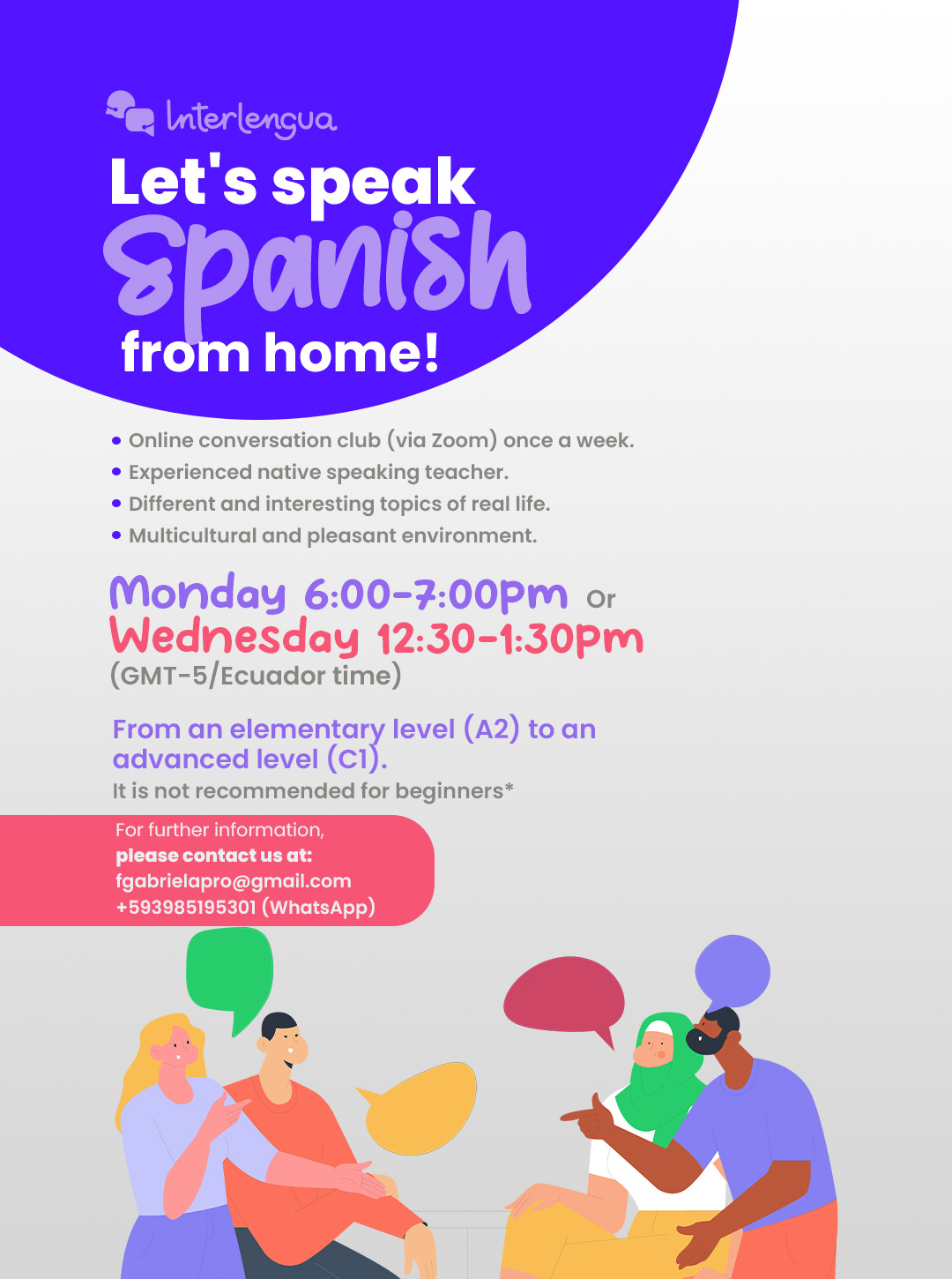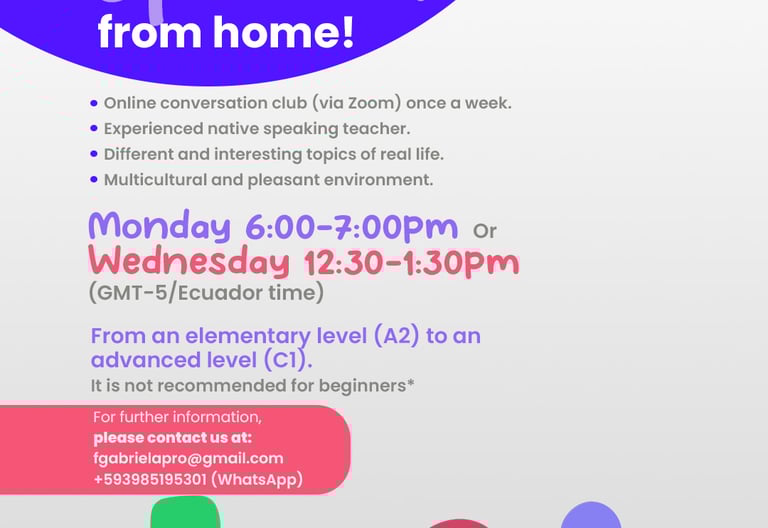 Conversation club meetings offer a structured, active and relaxed learning and they are perfect for those who want to socialize in a multicultural and pleasant environment from home, or want to enhance their speaking and interaction skills through different and interesting real life topics.